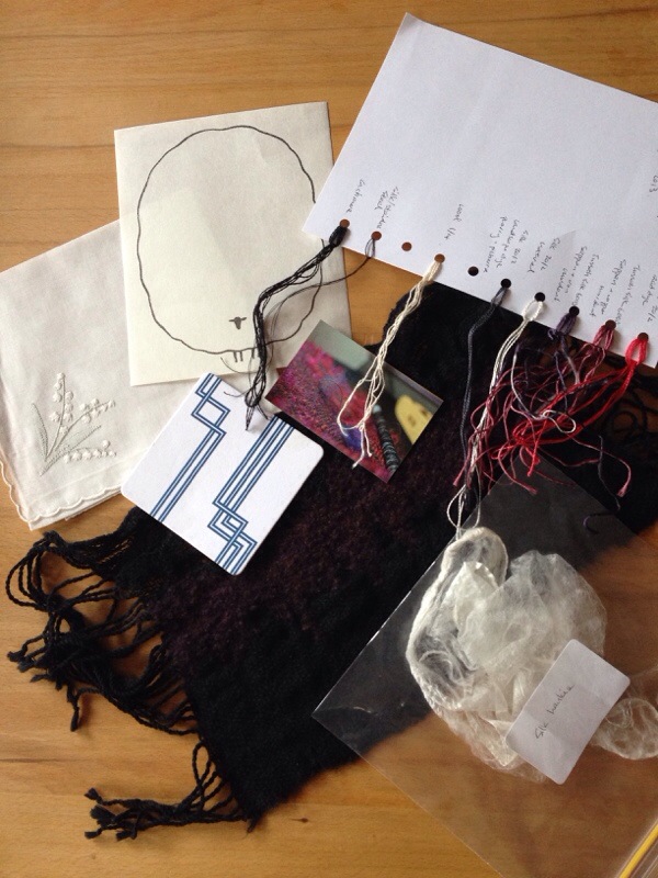 Ich habe mich sehr gefreut über das gewobene Saori Muster, Seidenfäden, ein besticktes Taschentuch, einen Untersetzer aus Japan mit einem interessanten Muster, einer originellen Schafzeichnung auf Seidenpapier und einem „silk hanky“ zum Verspinnen.
